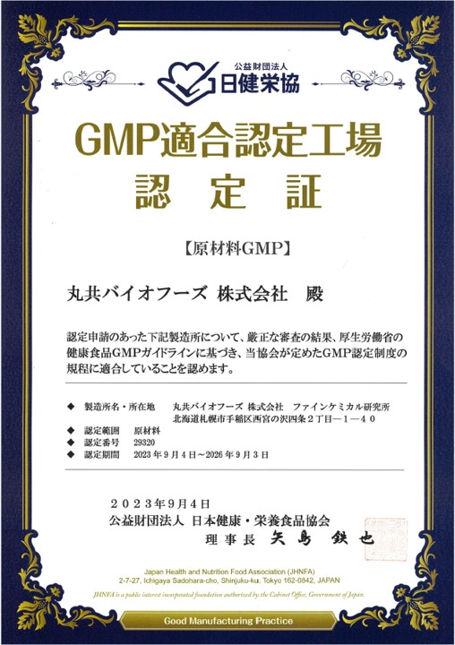ナノ型コンドロイチン(chondroitin sulfate oligosaccharides) はGMP認証工場である丸共バイオフーズ株式会社ファインケミカル研究所で製造されています。